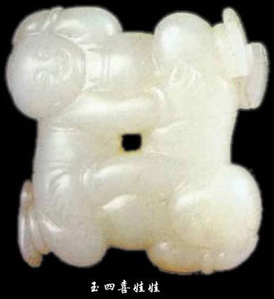 摩侯罗不仅仅是在宋代玉器中流行,也在当时大量的玩具中流行。陶瓷、泥的玩具都有,但今天保存下来的玉器为多。为什么呢?玉器容易保存,瓷器很容易磕破,更何况都是小孩的玩具,掉地上就碎了,也不当事就不要了。我见过瓷器的这种摩侯罗,也见过黄铜的。我有一个黄铜的摩侯罗,做成四喜娃娃的样子。所谓四喜娃娃,是指小孩的头和脚互相连接,做成转圈状。猛一看是两个人的形象,但你无论从哪边看,都是四个人,设计得很神奇。
