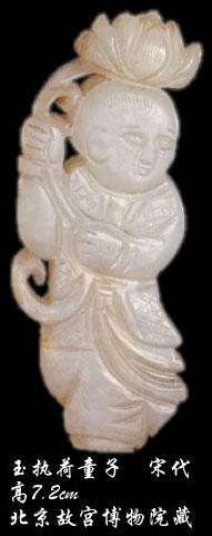 宋代的疙瘩件中,表现最多的题材就是小玉人。最多的形象就是执莲童子。何谓执莲呢?就是手里拿一个莲花,或者拿一个荷叶,这种执莲童子。这是世俗倾向的一个具体体现。为什么要把执莲童子的形象单独提出来推广呢?就是宋代的人口增殖。宋代的整体社会我们是知道的,宋代人都是以土地换和平的,他不期望打仗,所以在这个和平的年代,大家都愿意生孩子。人口增殖是所有国家寻求的一个目标。我们今天不是,我们今天因为人口增长过快,衣食问题解决,我们要计划生育。可是历史上不是,历史上所有的民族,不光是中华民族都在追求人口的增殖。为什么?在残酷的历史竞争中,人力资源是国家的第一资源,所以国家一定希望多生孩子。那么,玉雕童子为什么都拿着莲花或者荷叶呢?在宋代,以莲花、荷叶充当玩物的风气极盛,非常流行。