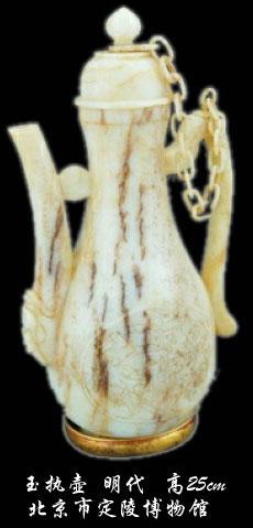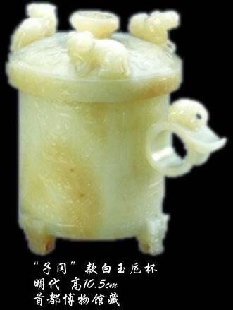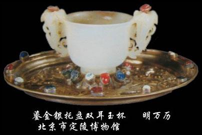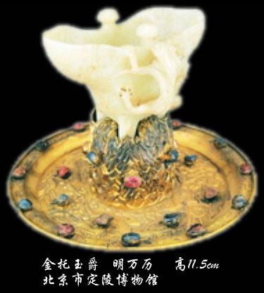 《金瓶梅》第三十回中,西门庆送礼。这回送的是"金壶玉盏",金的酒壶,玉的酒盏,礼很重。一般说来,小一点浅一点的杯,就叫盏。玉盏常见,今天在市场上很容易碰到。