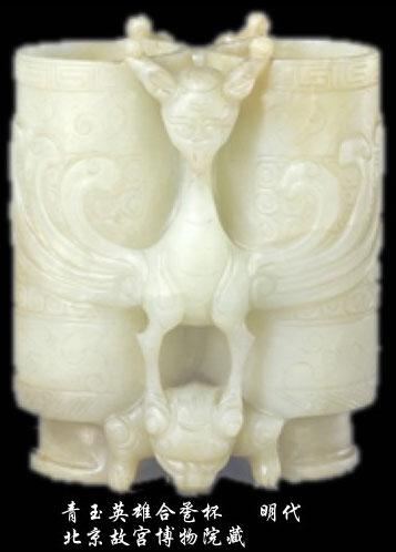 陆子冈款有一个很有名的玉器,样子很怪,这种杯有一个明确的名字叫"合卺杯"。过去是结婚用的,两个杯子做成一个整体,两人一人一杯酒,喝了就表示结为夫妻。今天结婚是一人拿一个杯,拐着胳膊肘喝,叫交杯酒。这件合卺杯上雕刻了两个动物形象,上面是只鹰,下面是只熊。鹰与英谐音,英代表花,我们说"落英遍地",就是说这花谢了,花象征女子。熊呢,不用说,"英雄"代表了男子。我们习以为常的"英雄"一词,闹了半天是指一男一女,很有意思。陆子冈用一个图解的方式,上面是鹰,底下是熊,鹰还踩着熊的脑袋上,表示了一男一女,两个杯贴在一起表示合卺。"卺"这个字也很有意思,特别不好认,但是你可以记住它,就是两个人紧密地在一起。