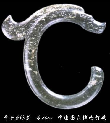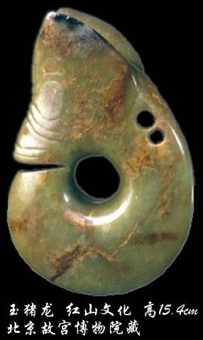 红山玉器的动物造型体现出中华民族一种原始的动物图腾,比如C形龙。C形龙是红山文化最为典型的品种,华夏银行的标志就是取自于红山文化的C形龙。C形龙是长嘴,长鬣。有人认为它的早期形象是受马的启发,仔细看,它的嘴和毛有点儿像奔跑的马。这个说法比较顺理成章,因为北方养马的历史非常久,而且依赖马的历史也非常久。还有一种说法,说C形龙的形象是从鳄鱼来的。它也确实非常像扬子鳄,尤其是龙嘴噘起的那一块儿,就别提多像了。但有一个问题不能解释,就是在红山文化的区域范围内,没有发现鳄鱼存在的痕迹,那么古人是怎么受到的启发呢?这就变成了一个谜。