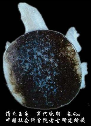 商代妇好墓里出土了一件很奇特的玉器,它的出现,推翻了过去的一些观点。玉器利用天然色泽来雕刻的时候,叫"俏色",或者叫"巧色"。比如有一块白玉,上面有一块黄,工匠把白色的地方雕成一只仙鹤,利用黄的部分雕成仙鹤头上的鹤顶红,就是俏色的做法。这种做工,原来被认为是明清两代才开始有的,由于工艺进步才出现。但妇好墓以事实打破了这种说法,它出土了一个俏色的甲鱼。玉工利用玉的深色部分做了甲鱼的壳,白玉部分做成甲鱼的头尾四肢。中国古人非常聪明,在大约四千年前的商代,就知道利用俏色了。