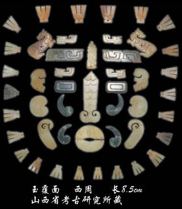 晋侯大墓还有一类特别重要的玉器,大批出土,每个墓里差不多都有,就是玉覆面。所谓玉覆面,是指用玉片对应人面部的眼睛、鼻子、耳朵、嘴的位置,缝在丝绸或麻布等织物上,再盖在死者的脸上。晋侯墓出土的玉覆面上玉片的数量不等,最多的一组有79块,在这之前没有发现过。用玉覆面,带来了一种丧葬文化,延续到后来。比如辽代的人很喜欢用金属做一个覆面盖在脸上,也有用整玉挖出来盖在脸上,就是从精神上要保证尸身不朽。实际上我们都知道,这是不可能的事情。