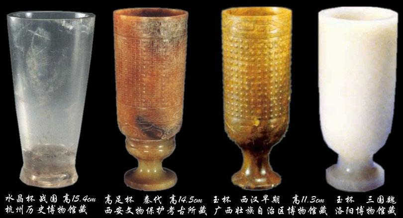 我们看玉器的容器是非常有意思的事情。因为玉器制造容器难度极大,一块那么坚硬的材料要把它掏空,难度极大。我们选取四个时期的玉杯来作比较。第一个是战国时期的水晶杯。水晶也是玉器的一种。第二是秦代的玉杯,陕西西安出土。第三个是西汉早期的玉杯,广西出土。第四个是三国时期魏国的玉杯,河南洛阳出土。四个杯子排成一排,可以清晰的看到传承关系,跟我们今天用的酒杯有异曲同工之处。