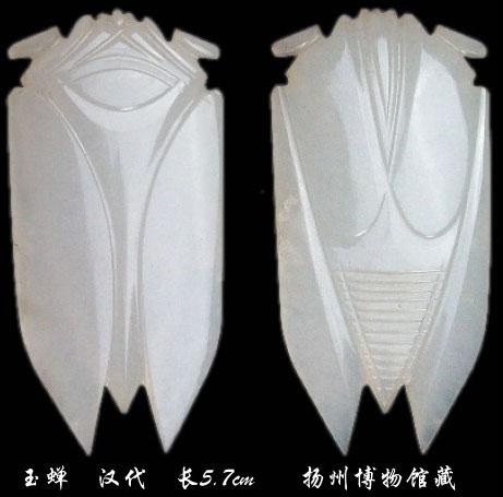 汉代丧葬制度里,玉非常重要。之所以有大量汉玉出土,就因汉代丧葬制度规定,随着等级增高,玉的数量也在增加。葬玉中有个典型的品种叫"玉唅",是放入死者口中的玉。 什么样呢?一般都做成北京话叫"知了儿"、"季鸟儿"。为什么古人要把玉唅做成蝉状呢?它是有含义的。蝉从幼虫变成成虫,从地底下钻出来的时候一定要蜕变。一味中药叫"蝉蜕",就是那个蝉蜕下来的壳。我们小时候的时候经常下雨后都去树林里去找爬出来的季鸟猴,就是蝉的幼虫。