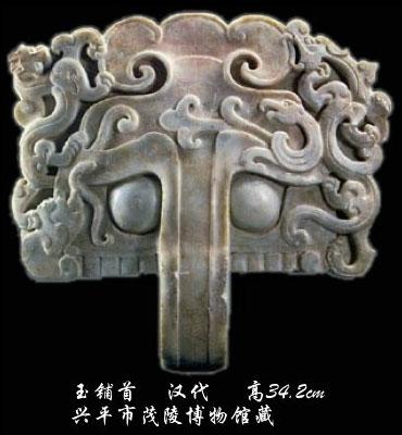 我们一直在说汉代的葬玉制度。汉代人为什么要葬玉呢?就是因为他认为玉能使人不朽。早期呢,他要有一些塞,塞住死人的所有的孔。有九塞制,九个塞。那么,我们看看是什么样子。光看图就像一个鬼脸,一般塞是指眼睛一双、耳朵一双、鼻子孔一双、嘴、生殖器、肛门,九塞。