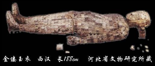 我们对葬玉制度了解得最深刻的往往是金缕玉衣。只要对我们中国的玉有所了解的,一提就是金缕玉衣。《西京杂记》中这样记载,它说:"汉帝送死,皆珠襦玉匣。匣形如铠甲,连以金缕。"就是汉朝的皇帝死了以后,他里头是衣服,外头就是玉做的匣,所谓匣就是玉衣,然后连以金缕。玉衣是有等级的,有金缕玉衣、有银缕玉衣、还有丝缕玉衣,等级不一样。它是用小玉片,四个角上都有孔连接起来,把人包上。只有帝王和贵族才能享受这个葬制等级。