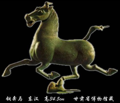 我们大家知道最多的汉马形象,就是全国旅游标志"马踏飞燕",也叫铜奔马。我们可以拿它和这个玉马做一个横向比较。这个玉马和这个铜马,它在很多细部非常一致。比如,这个玉马,它出腿都是一侧单出,"马踏飞燕"也是。它都是一顺边的。你们注意一下马的姿势,它的右腿是一顺边的往前,"马踏飞燕"也是这样。所以有人认为,这就不是中国马。中国马迈右腿的时候,左后腿就跟前,它是错位的。