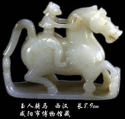 汉代玉器中有很多实用器,它保存下来就非常不容易,因为我们毕竟有两千年的历史了,所以汉代比较完整的摆件都基本上是国宝。比如陕西咸阳汉昭帝平陵遗址出土的仙人骑马玉摆件,非常地有名,国家级文物。它底下的这个云纹表明它在天空上飞行,嘴都是张开的,你注意看,它都是张开的;露齿,露着牙齿;眼睛直视前方,比较突出;耳朵直立;尤其尾巴,上翘,飘逸状。